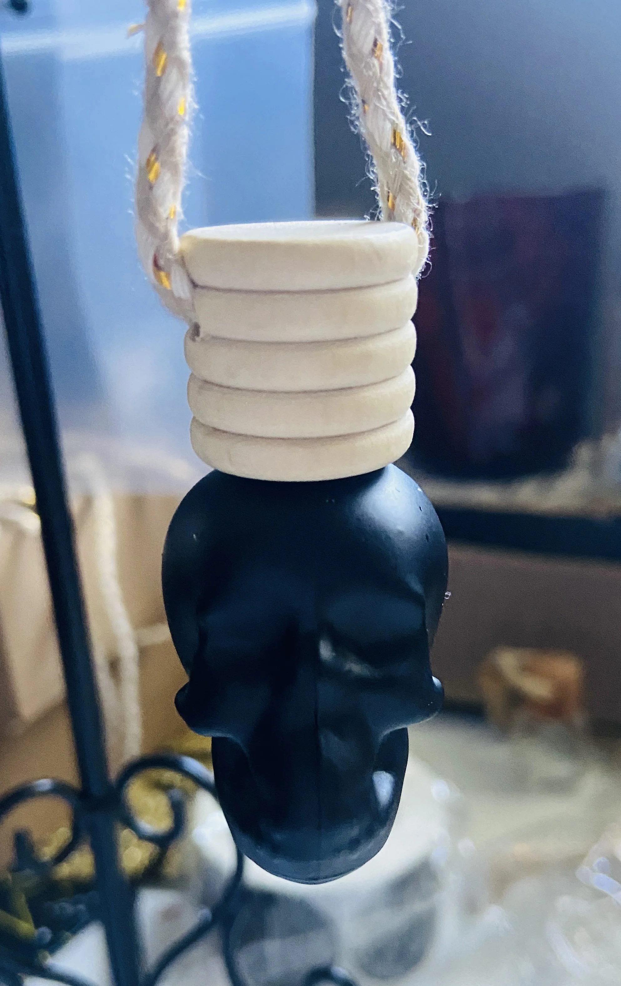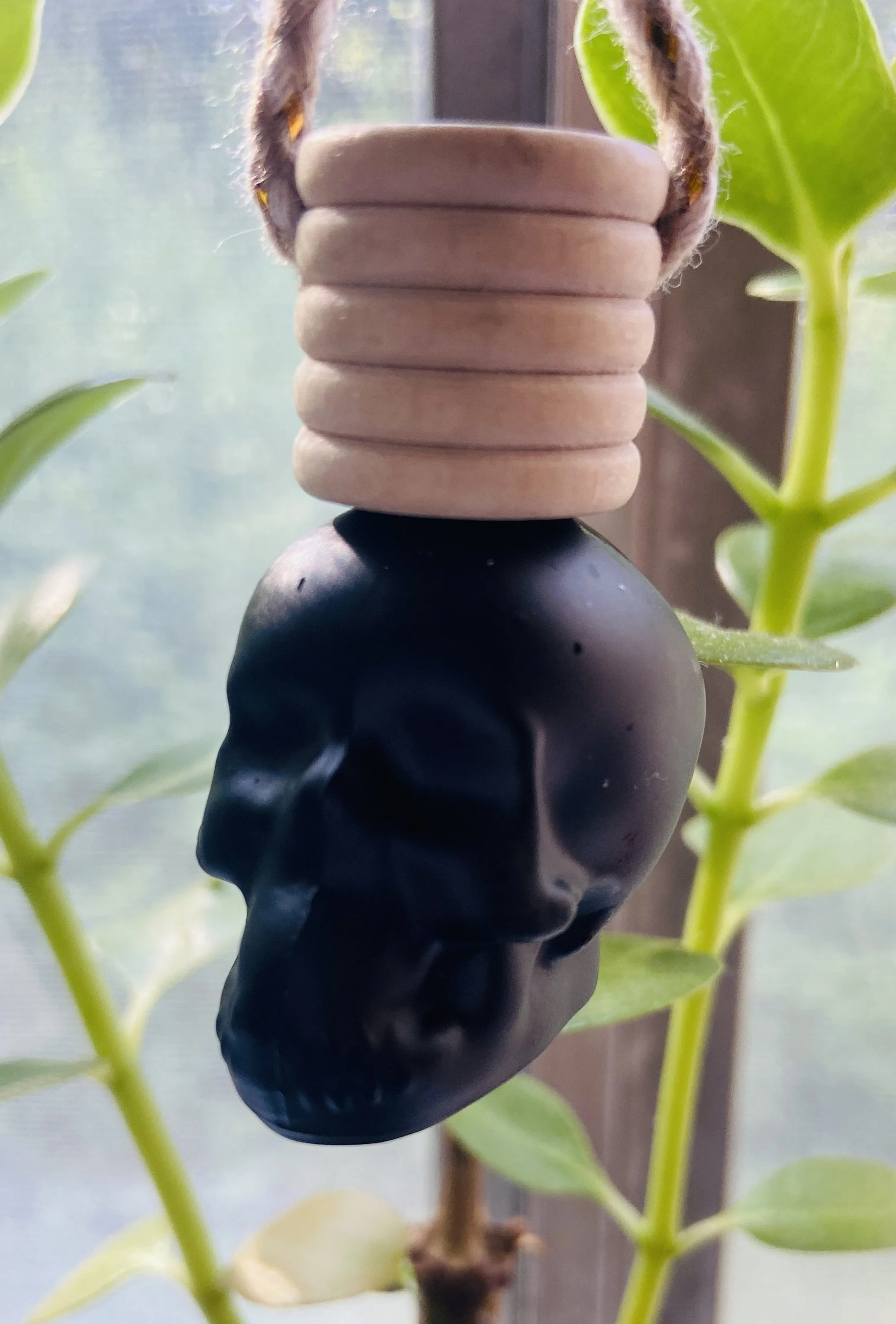 These are black glass air fresheners. They are in the shape of a skull! Choose your favorite scent and hang anywhere and everywhere. Ahhhhhh smells delish in here!!!!
